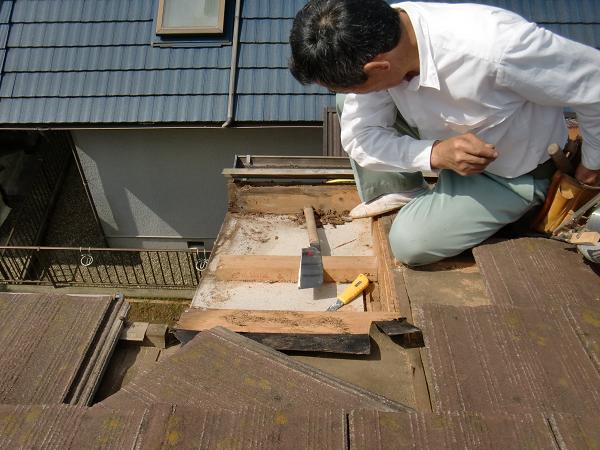新しく取り付けた水切りに平瓦が納まりました。雨水が水切りを通って流れるように、金槌やサンダーで加工しながら取り付けます。 | |